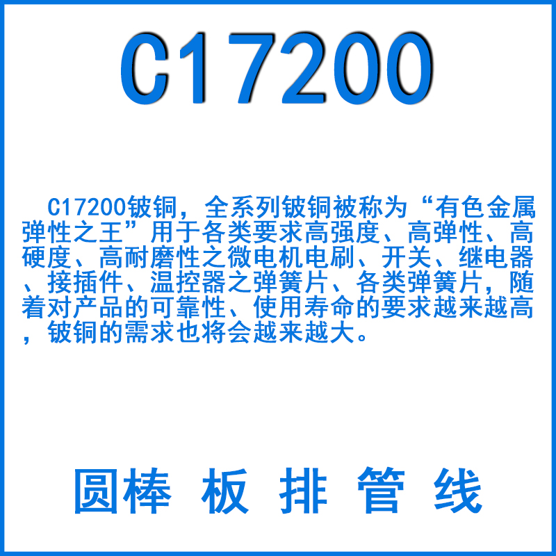 C17200鈹銅是進(jìn)口鈹銅的一種。C17200鈹銅,全系列鈹銅被稱為“有色金屬彈性之王”用于各類要求高強度、高彈性、高硬度、高耐磨性之微電機(jī)電刷、開關(guān)、繼電器、接插件、溫控器之彈簧片、各類彈簧片,隨著對產(chǎn)品的可靠性、使用壽命的要求越來越高,鈹銅的需求也將會越來越大。