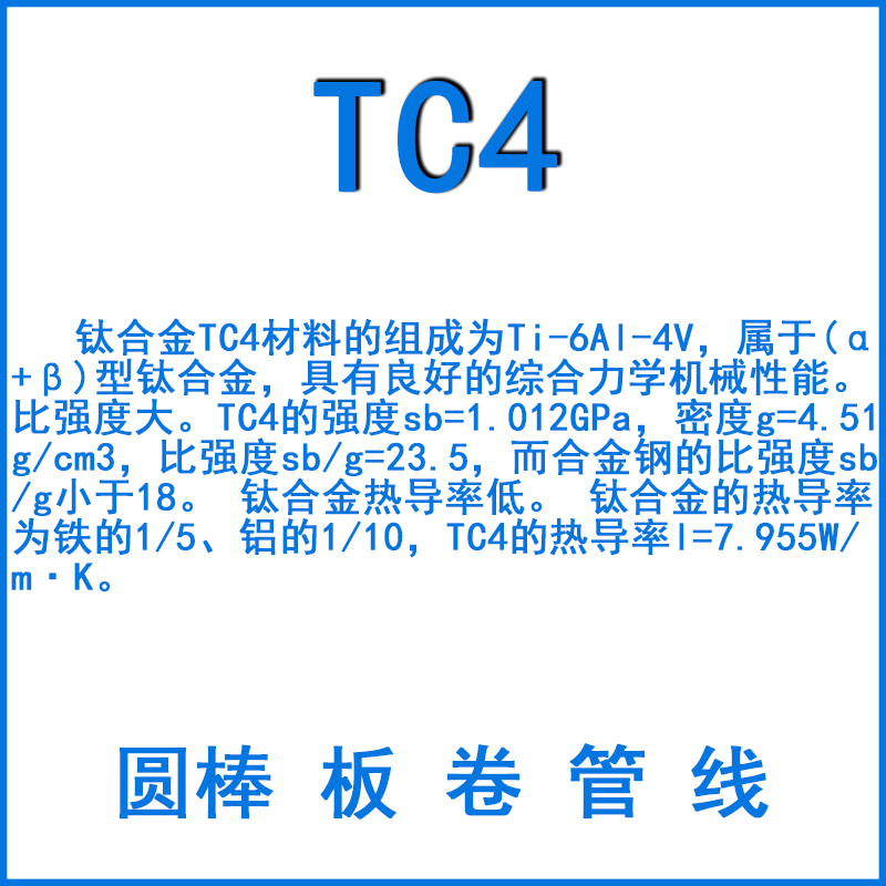 TC4鈦合金的組成為Ti-6Al-4V,屬于(α+β)型鈦合金,具有良好的綜合力學(xué)機(jī)械性能。比強(qiáng)度大。TC4的強(qiáng)度sb=1.012GPa,密度g=4.51g/cm3,比強(qiáng)度sb/g=23.5,而合金鋼的比強(qiáng)度sb/g小于18。 鈦合金熱導(dǎo)率低。 鈦合金的熱導(dǎo)率為鐵的1/5、鋁的1/10,TC4的熱導(dǎo)率l=7.955W/m·K。