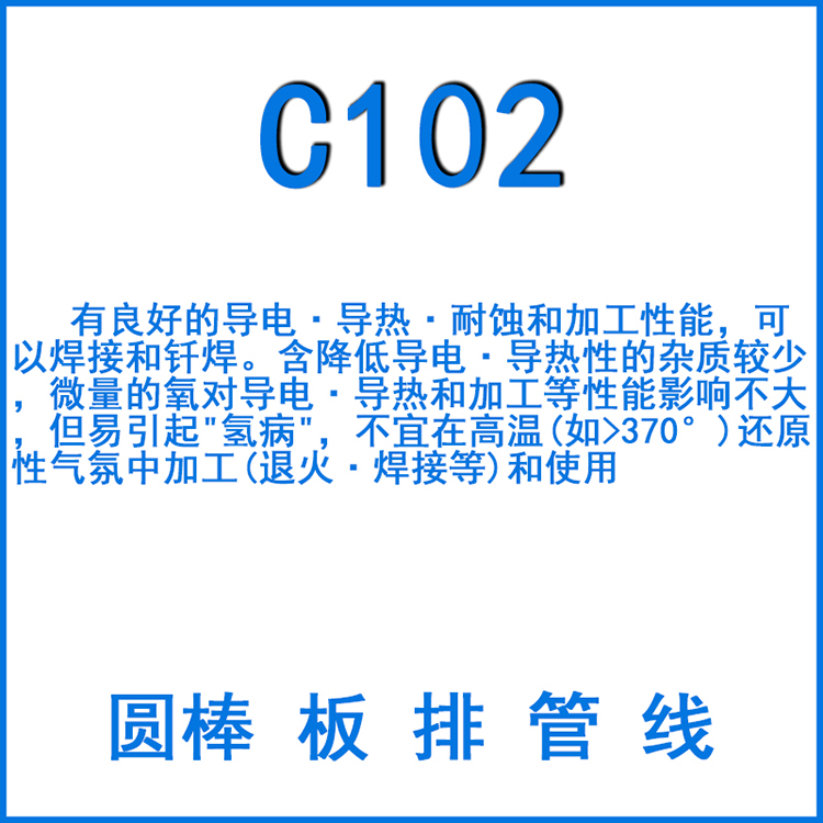 有良好的導(dǎo)電.導(dǎo)熱.耐蝕和加工性能,可以焊接和纖焊。含降低導(dǎo)電.導(dǎo)熱性的雜質(zhì)較少,微量的氧對(duì)導(dǎo)電.導(dǎo)熱和加工等性能影響不大,但易引起"氫病",不宜在高溫(如>370°)還原性氣氛中加工(退火.焊接等)和使用