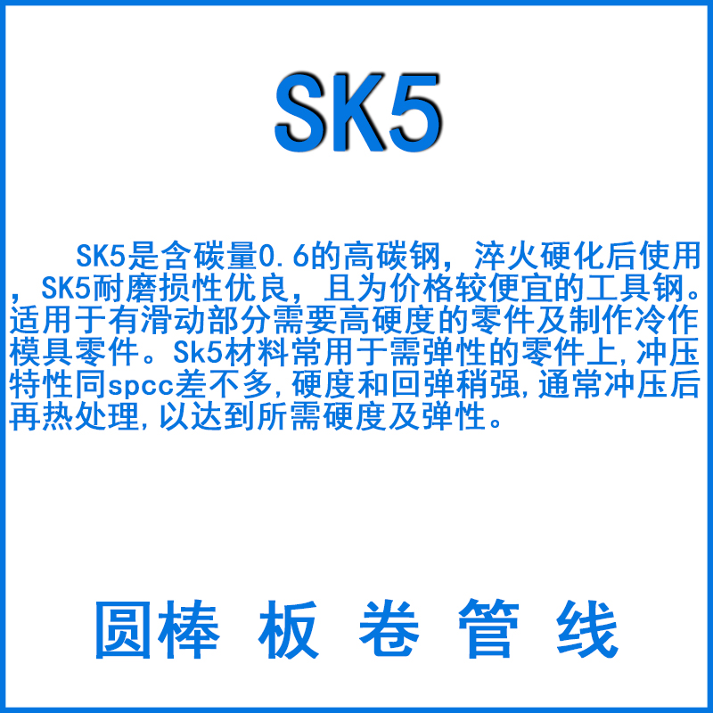 SK5是含碳量0.6的高碳鋼,淬火硬化后使用,SK5耐磨損性優(yōu)良,且為價格較便宜的工具鋼。