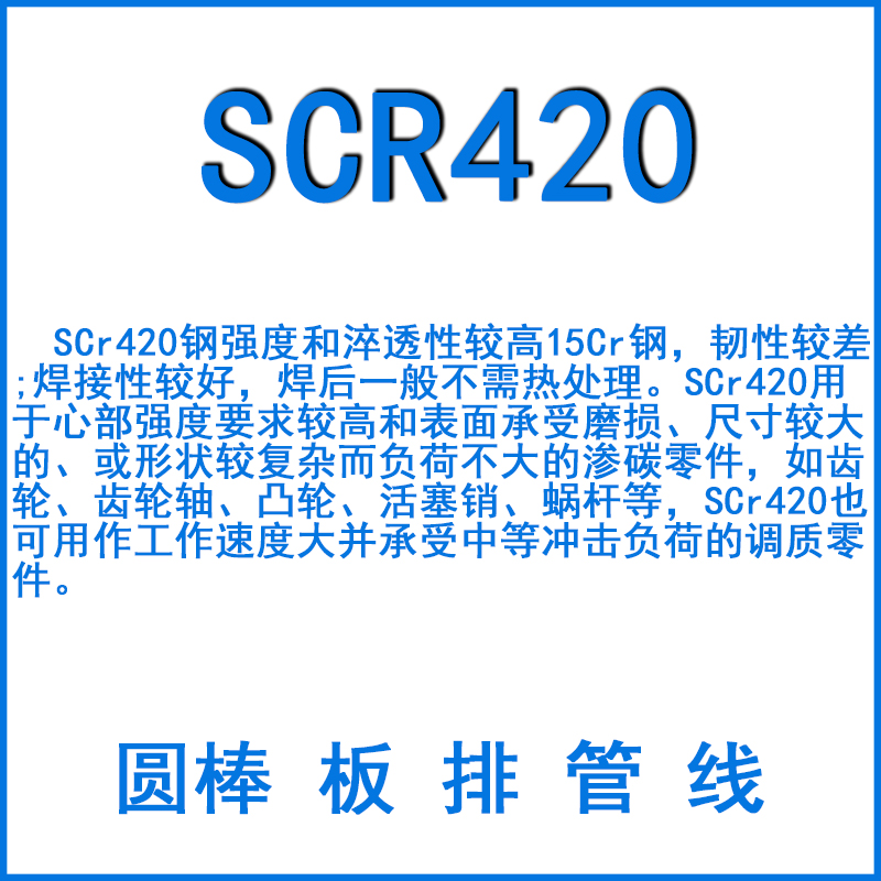 SCr420鋼強(qiáng)度和淬透性較高15Cr鋼,韌性較差;焊接性較好,焊后一般不需熱處理。SCr420用于心部強(qiáng)度要求較高和表面承受磨損、尺寸較大的、或形狀較復(fù)雜而負(fù)荷不大的滲碳零件,如齒輪、齒輪軸、凸輪、活塞銷、蝸桿等,SCr420也可用作工作速度大并承受中等沖擊負(fù)荷的調(diào)質(zhì)零件。